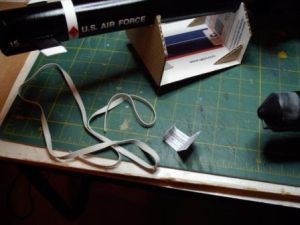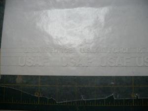 At this point, the model was ready for paint. I first painted Tamiya gray primer then over-coated it with flat white. Next, I painted the windows of the cockpit gloss sky-blue and the glider nosecone gold. In order to get the U.S. Air Force lettering, I used vinyl lettering as masking. I laid out all the letters on wax paper using pencil lines on paper as a guide. Next, I rubbed masking tape over the letters and peeled them off the wax paper. Using the tape, I applied the letters onto the model, and then peeled off the tape, leaving only the lettering behind. The rest of the stripes and the wingtips were masked off with Tamiya masking tape along with the cockpit windows.