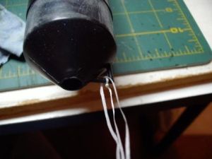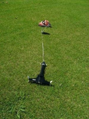 The last bonus item was dental floss. I decided to use it to extend the shock cord and connect the nose cone to the rubber band. One strand of floss seemed too fragile, so I braided three strands together by tying one to the eye of the cone and looping another strand through. These I braided together for strength, and tied to the shock cord. I then attached the 18" parachute to the nose cone.