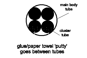 Cut the half-inch BT-55 ring and test fit before gluing in place. The bottom of the ring will sit about 1/8" from the ends of the BT-5s. When ready to glue, spread four fairly wide lines of glue inside the ring. Insert the clustered BT-5s, so that the glue is between the tubes. Now rotate the cluster inside the ring so that the glue is pushed up into a fillet shape along the tubes. Add more glue to the other side of the tubes.