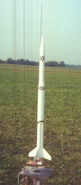 I sealed, sanded, and primed as usual, followed by a solid coat of white. After letting it dry for several days, I added the roll patterns by cutting squares and rectangles from a roll of ¼" pinstriping bought at a local auto store. Some rub-on lettering supplied the numbers on the lower booster support ring, and NARTS has decals with the vertical United States available.