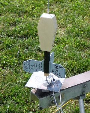As soon as I saw Dick Stafford's 'Boot Hill' rocket, I had to build one. It is a fun rocket, and I want to give all due acknowledgments to Dick! That said, I made one modification to Boot Hill that employs rubber bands to pull open the coffin lid, instead of using ejection gases to push it open. The ejection charge gases are now used to burn through a thread that is holding the coffin lid ...