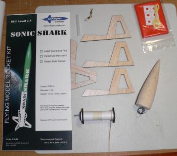 Sonic Shark(08/04/08) SONIC SHARK: a new release from InFlight Model Rocketry and my first kit from them. As I've often said, I like trying out new kit manufacturers. I think over the years it is more to see how ideas and techniques are incorporated into kits. InFlight is relatively new on the scene and has produced some Clone kits and a couple of their own designs. The Sonic Shark (as stated) is their newest original design release.