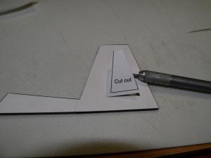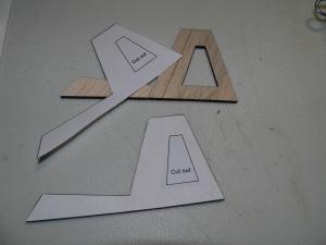 Fin preparation includes sanding them all even. Each of the four fins are assembled from two pieces; the forward piece and the trapezoid piece with the "window" cut out of it. The fins are glued together and you are instructed to lay them in-between two heavy books to keep them flat. A unique feature of the kit is to cover both sides with the provided adhesive paper after they dry. (NOTE: the paper provided in my kit had a mistake that InFlight has corrected. All eight of my pieces were for the left side. I had pre-cut them all according to the template before I realized it. As I said, InFlight has corrected).