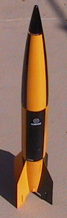 Scale model of infamous German WWII V-2 in 3.9" dia x 37" tall scale with 29MM motor mount that can handle up to 29 x 240 hardware. Empty weight of this rocket is 53 oz including nose cone weights for a G64 RMS. VCP is at 12.7" and CG at 16.8" fully loaded with G64 RMS, tubular nylon shock chord and 45" ‘chute. The rocket features include wad-less recovery using ejection charge cooling system, adjustable nose cone weighting and styrene 1/8 plastic thru-wall fins. Paint finish is the yellow/black White Sands paint scheme.