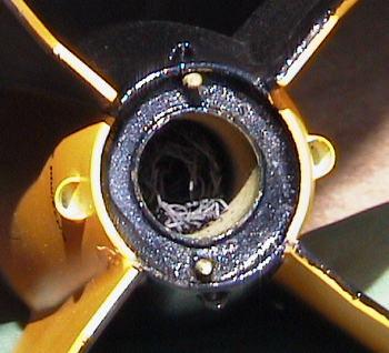 I designed the 29mm motor mount to accommodate up to a 29 x 240 RMS hardware, but typically will be flying using 40/120 29mm RMS. I built into the base 2" ply centering ring two #8 x ¾" brass machine screws and fashioned an engine retaining plate made from a piece of brass with holes for screws and engine nozzle. Small wing nuts are used to secure the brass plate over the RMS hardware. Flight preparation is a simple matter of dropping in and securing motor, and then attaching ‘chute to shock cord using a key chain ring and putting on the NC.