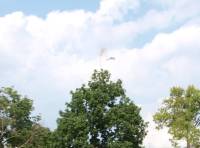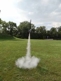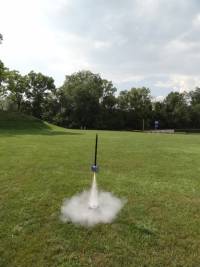 For the first flight I used an Estes B4-2, which is one of the engines suggested in the instructions. The instructions claimed that this motor would take the rocket to 144 feet, which is pretty close to what I think it got to. B6-4 Field is fairly cozy, so I wanted to start things off with a low level flight just to see if it would actually leave the rod. As a matter of fact, it left the rod fairly nicely, and actually appeared to be flying as advertised before there was an "anomaly" (i.e. the plastic flight coupler uncoupled,) and the whole mess started skywriting. At the time I thought that would be it, and retired the rocket for a couple of years until I decided to re-glue the parts and try again.