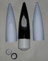 In the original, the tail cone is made from a paper shroud, and is straight. In the scale up, I decided to use a nose cone for this surface to create a curved boat-tail. This is partially because I think the nose cone will make a stronger tail than a styrene sheet, and partially just because I like the look of the curved tail better.
