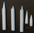 The Quasar was among my favorite rockets in terms of style. Its simple and elegant 50's style is quite appealing. I also like the "jet" look of the pods. The jet cones and tails in the original kit were my first encounter with vaccuform. The original Quasar had an ejection baffle - mine met its end through the shock cord coming out of the main body.
