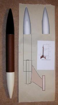 The first step in construction is to make a full size plan. This might seem tedious, but I always start this way, and it helps to work out the design problems and is a nice aid in building. For this particular rocket, the plan helped in adjusting the nose cone, body tube, and tail cone lengths to get the right overall size, as well as making a fin pattern with precise TTW fin tabs. The nose cone was laid out, including the cockpit, by enlarging a photo of an original nose cone to proper size. (I got the photo from someone who was kind enough to email it - lost track of who now).