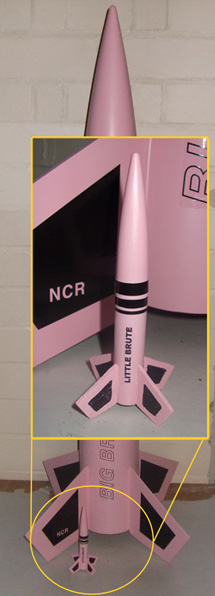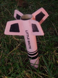 The whole rocket was painted pink to match my original Big Brute, felt tip marker was used to black out the fins. Three strips of black tape were added to give the strips. The name of the rocket, Little Brute was printed on pink paper and then glued into place. I could not bring myself to put the original name in such a small rocket.