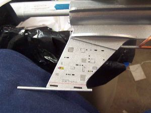 The warp engine pods were attached to the pylons with 5 minute epoxy. I did one side at a time and mixed a small batch. This was ladled into the slot on the pod so that it would cling to the area where the pylon would hit the opposite wall of the tube. The pylon was then slid into the slot and held straight until the epoxy set up. Another small batch of epoxy was then mixed and used to fillet the joint between the pylon and the outer edge of the pod. When dry, the opposite side of the same pod was filleted and the entire process was repeated for the opposite engine.