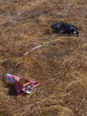 The first flight damaged to parachute some with bits of burning debris. I attribute this to the baffle being located just forward of the motor mount and getting the full brunt of its fury at ejection. This is contrary to recommended practice but I did it there to give more room for the chute. I needed it. Still, the chute was tough enough to survive, bring the rocket down safely and even be used for a second flight. A regular plastic chute would not have worked under the same circumstances.
