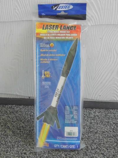 The "Laser Lance" looks like a military styled guided missile. Estes started releasing this kit in the summer of 2011 and my decal sheet was stamped 12/09/11 making it one of the early kits. This rocket is 20.3" long with a dia. of 1.64" and an estimated wt. of 2.8 oz. Recommended engines are: C11-3 (1st flight), C11-5, D12-5, D12-7 with a predicted altitude of up to 925 ft. This was another rocket that I scored direct from Estes on there last clearance sale.