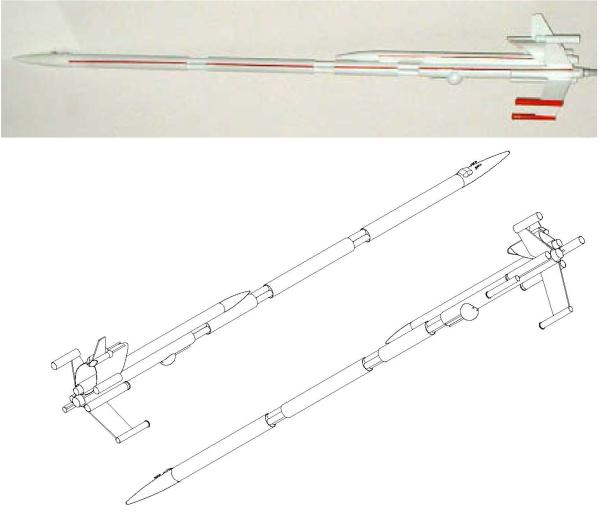 She flew "in her underwear" (primer) at the June 28, 2008 MASA launch at the Nowthen sod farm. It flew on a cluster of one D12-5 and 3 C6-5s. It ripped off the pad to a nice straight flight in spite of the 15-17 mph winds. Recovery is via three different 12 inch parachutes, (as that is all I had in the box) two deployed out the main nose cone and one from the upper BT-50 tube, at mid body. The rear chute tangled with the fins and guns. After the contest, i will switch it to a single larger chute.