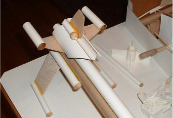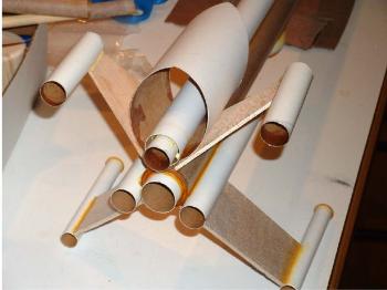 Most of the balsa stock that came in my box-o-parts was small bits, old die cut skeletons and miscellaneous bits, so I thought that a mixture of tube fins, balsa and tube tips would make a nice design.
