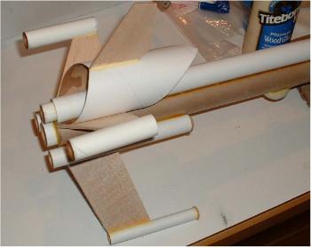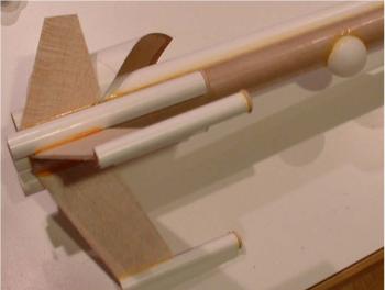 Attach two 6 inch BT-20 sections at the junction of the lower fin/ body tube junction, flush with the rear tube. I capped them with some larger wooden caps from the ole-box-o-parts.