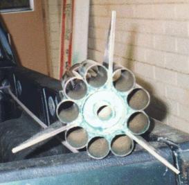 Thus far, the G35 and G80 have produced great flights. They had a delay of 7, but maybe 4 would be better, as it seemed to me that the chute came out at only a couple hundred feet. No nose weighting was needed. However, with the H97 and H180 I plan to use, I will probably add 3 or 4 ounces to the nose to increase static stability. On the other hand, the tubes act as fins themselves, so maybe the weighting might not be needed. I'll be testing this soon. Thus far, flights have been straight and cool. Watchers liked it a lot and stopped me for photos.