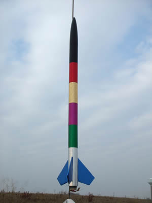 The cover art illustrates a neat hodge podge of colors, one for each of the individual tubes, and I decided to go along a similar route using various cans of Krylon that don't get much use in my typical sport rocket use. I started with two coats of gray primer, sanding between, then went for the various leftover colors in the scheme. That turned out to be a pretty bad idea. I've had some trouble with Krylon compatibility between old and new, but generally figured new would work OK over old primer, and old Krylon would certainly work over old primer. Not so--I had a crinkled mess. Rather than spend another week or so sanding and reworking it, I bailed and went with decal wraps of various colors I'd picked up from Aerospace Speciality Products. That wound up being quick, easy, and looked great.