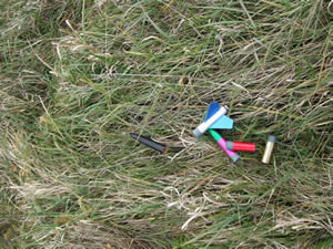 For the first flight, I took advantage of a calm day and went for the max C6-5. It zipped fairly quickly and dead straight, though as it started to top 1000 feet I realized flying this on a C, with no tracking powder, was possibly a mistake. I could barely track the smoke trail from the delay against the overcast sky, and knew there would be no chute or streamer to pick up. I was just able to spot it as it broke apart at ejection.