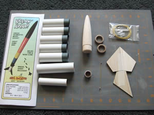 The Break-Away kit is an ordinary looking 3-fin design, at least until recovery time. It's intended to break into several pieces and tumble safely down, much like the Estes Wacky Wiggler, though this design features good old fashioned kraft tubes and balsa throughout.
