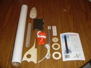 The Madcow Rocketry Batray is a new 2.2 inch diameter MPR kit with bat wing shaped fins. It can be flown on a wide variety of motors, both BP and AP (composite) 24mm and 29mm. It will fly on anything from an Estes D12 up through SU and RMS F class motors. Each flight returns safely with an 18 inch nylon chute.