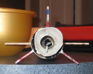 This was a simple kit to build, however there was no thrust ring included in my kit. This was no problem--I just made my own. I modified mine with an Estes "E" motor hook for retention as well. This kit uses no (mechanical) motor retention otherwise. The Kevlarshock cord is mounted to the thrust ring with a small groove cut into it with a X-Acto knife. Finally, the centering rings were glued on and set to dry. This kit uses a paper template to mark where the fins go. There are three main fins and two wings. The three fins are one piece each and the wings are two pieces each. I would have preferred having to mount the fins through the wall, but the kit was designed for them to be surface mounted. The nosecone doesn't require anything special, just a piece of tape around it for fit. Finally, I slid the motor mount inside the body tube so that 5/8" of the motor tube stuck out the back. Next, I glued the launch lug under the left wing. The parachute went together easily. It required cutting out, sticking on of tape rings, and shroud line cutting and attachment. The final step was cutting out the paper nozzle and gluing it to the thick centering ring. This slides over the back of the motor mount for a futuristic look.