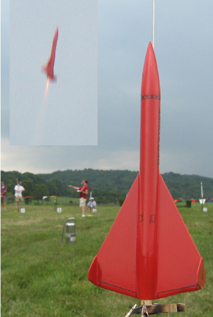 I built the Red Strike as a beta test for Red River Rocketry prior to the actual kit production. It is a BT-50-based rocket that features a boat tail, flies on 13mm motors and recovers on a 12” mylar parachute. The Red Strike is an excellent model for flying on small fields and the design is outstanding. Not your typical three fins and a nose cone.