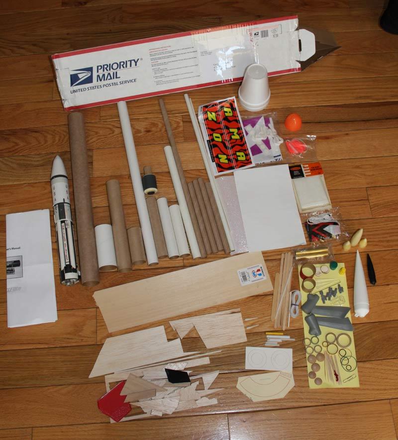 I received my box of parts and was surprised at how much stuff was sent back in comparison to the amount I submitted for the contest. Some of it should have been thrown out ages ago, some of it was good, but there was clearly enough to build a rocket or two for the contest. I had my heart set on building a boost glider before seeing the box of parts, and was a bit disappointed by the lack of usable balsa once it came. However, there was some balsa included and a nice sheet of 1/8 inch basswood. Surely, I could come up with something. I even contemplated using the box itself for wing or fin material which I usually reserve only for making centering rings.