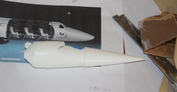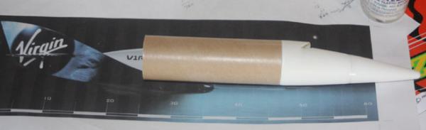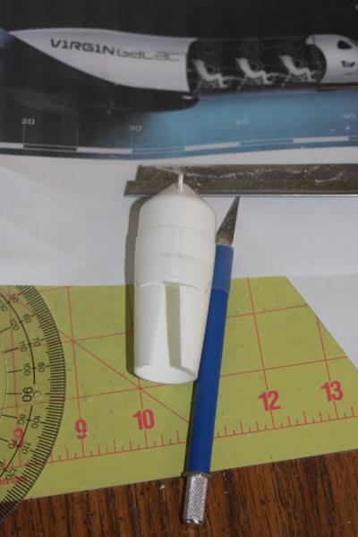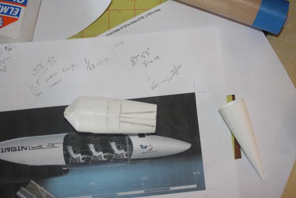 Searching for data on SpaceShipOne inevitably leads a person to pics and articles on Virgin Galactic’s, SpaceShipTwo. Once I saw the concept art for SpaceShipTwo, I was hooked. This looked like an even more promising design for a boost glider. And, I had a plastic BT55 cone in my parts box that could possibly be modified to suit my needs….or close enough for the contest’s sake. I downloaded several photos and press images from http://www.virgingalactic.com and started the process of scratch building. Keep this link handy as you’ll need to download some of the same images I did for your build. I failed to make any templates and you’ll see why later.