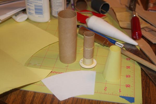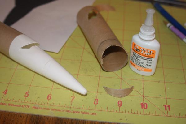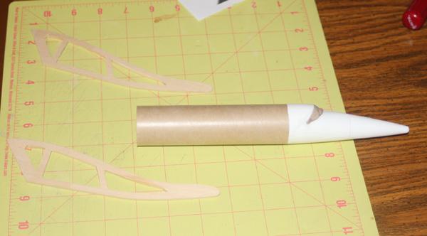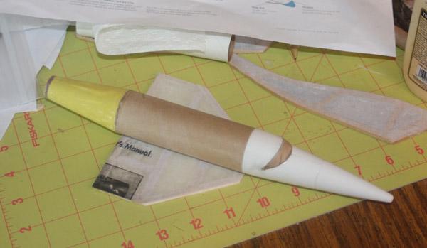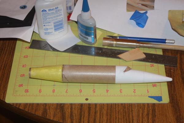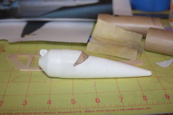Construction started with the nose cone. Someone was generous enough to donate a PNC-55AC. If you know the Cherokee D, then you know this cone. It was much too long to keep it in scale with a BT55, so I began hacking away with my razor saw.