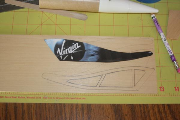 While the glue was drying in the previous steps I took the time to make the vertical booms for SS2 spacecraft. Using the profile view that I obtained through Virgin Galactic, I was able to make a template directly from the computer printout. I traced it to my 1/8 sheet of basswood. The intention is to still make this a boost glide so I drew a frame pattern within the vertical stabilizer, hopefully reducing weight after it’s cut out.