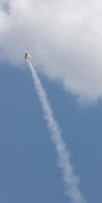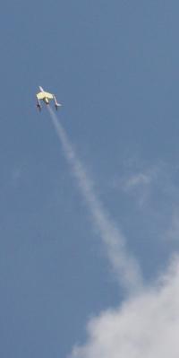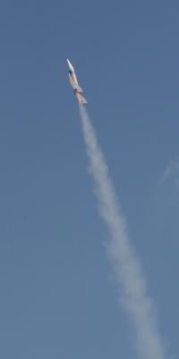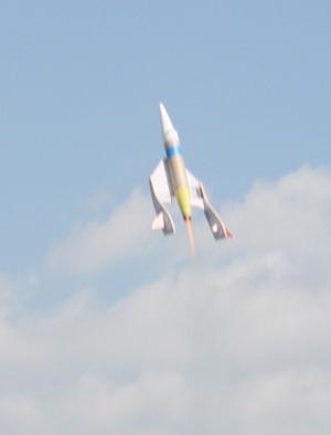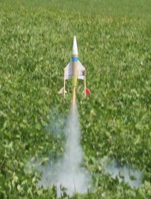 And now, a test flight……The first flight was miserable. I had already added several grams of clay to the nose, but obviously not enough. I flew it on a B6-4 for the first flight. Went up about 50-75 ft., looped a time or two and was still under thrust when it decided to fly downward. Hit the tall hay and blew the ejection seconds later. Surprisingly, no damage whatsoever. The tall hay I had cussed while looking for my Scout was now my friend. Back to the drawing board.