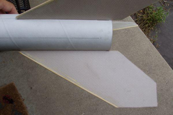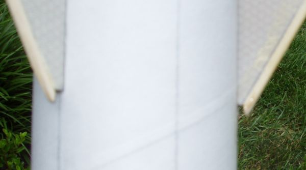 When mounting the fins, one problem became evident. The fin tab in the front is 1/8" longer than in the back. At first, I thought I would simply have to trim the short section of the fin overhang immediately behind the tab. However, it turned out that this depth was correct for the tubes I was going to use, so I would also have had to trim the entire tab. Another possible fix would have been to extend the frame 1/8" further down. This would have left a small gap in the root tip that would have been easily filled. Unfortunately, I figured this out after I had finished. The good news is that the gaps were easily plugged with small pieces of the balsa I used to frame the leading edge.