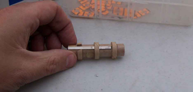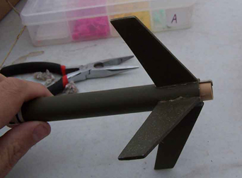 The first centering ring is glued in place at the foward end and a slit for the hook is made just below it. The middle ring needs to have a small piece cut out (not all the way through) to accomodate the hook and is glued in place. The last ring has an 1/8" segment completely removed and it is glued in place flush with the end. All the rings are then filleted.