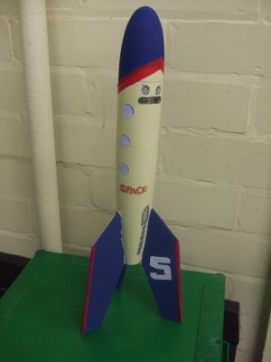 The rocket was primed and then spray painted yellow. The fins were then hand painted blue, as was the nose cone. The