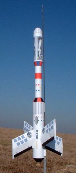 Brief: The G-200 is a large paper rocket that flies on 24mm motors. The diameter of the lower tube is about 2 3/8" vs the 2" in the specs above the first review--just a skosh too small to fit the Fat Boy cone that was sitting by my computer. It features a clear payload section (one of the few non-paper components) and two build options. The Orbital Launcher option deploys a ...
