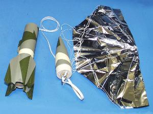The recovery system in this rocket is your standard elastic shock cord that is attached to a screw eye in the nose cone, and to the outside top of the engine mount. I have my concerns here since I have seen many a shock cord burned through by the ejection gasses. I would be more comfortable seeing a Kevlar tether attached to the engine mount. The Parachute is a 15" mylar heavy duty ASP kit. The heavy duty kit has shroud lines that go over the top of the canopy for added strength. the parachute comes with a heavy duty swivel snap for ease of removal of the parachute.