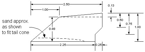 Fins: Make a template using the attached diagram. Note that I was not careful with these dimensions and they can probably be improved by referencing Pete Always's book or other on-line resources. Most any scrap balsa can be used, but I used 1/8". Make sure the grain is parallel to the leading edge, etc. Holding sandpaper on the boat tail, sand the root of each fin so it conforms to its curve. Glue the fins on such that they overlap the BT by ¼".