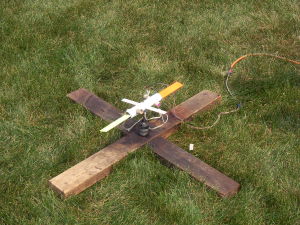 You form thrust rings with masking tape and friction fit the motors so they won't fall out. The motors should be oriented with their nozzles down. As with a Art's standard monocopters, you need a sturdy pad with a short ¼" rod (1" or so). Art provides plans for a suitable monocopter pad in the instructions. You will also need a clip-whip or a launch controller capable of firing two motors reliably since there is no way to twist those igniter wires together.