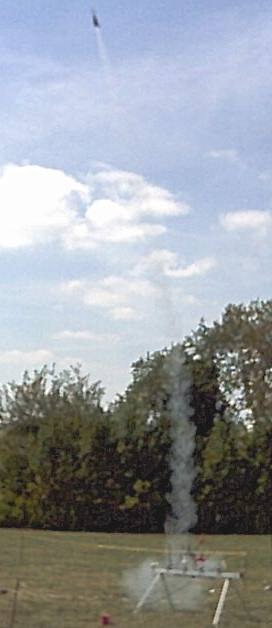 Since the wind was fairly heavy, was blowing towards the trees AND this was the first flight of the day, I decided to try a B6-4. The boost was good with some weathercocking but no sign of any wobble. The heavy plastic nose and weights did their job. (Please excuse the poor launch pic, but I just had to include it since it is the first one I've caught.)