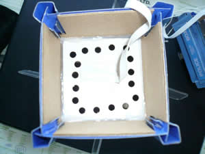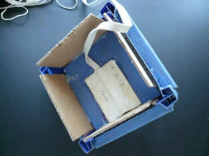 I made baffle for the TARDIS by wrapping a piece of posterboard 35mmX150mm around the motor mount and marking the overlap. Then I sprayed the overlap with Super 77 and wrapped the poster board around the motor mount again to glue it into a tube. I slid the tube off and punched two rows of holes in the bottom with a one hole punch leaving 5mm of posterboard before the first row of holes to slide the tube over the end of the engine mount and hot glue it in place. Next, I cut a square of corrugated cardboard that would fit perfectly into the inside of the TARDIS. I marked a 1" circle in the exact centre and punched a row of holes along the outside edge with my one hole punch. Hot glued the end of the tube to the circle on the cardboard and slid the whole baffle/motor mount assembly into the TARDIS from the top. Once in position, I ran a bead of hot glue around the upper edge of the baffle where it met the TARDIS walls and a second bead around the end of the engine mount where it protruded from the base of the TARDIS.