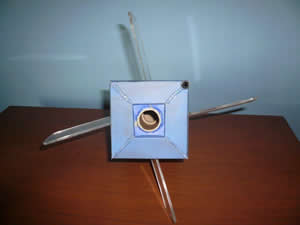 This is the first place where I could have saved some weight. I should have laminated the sides straight to the cardboard and skipped the poster board (hindsight is 20/20). The small trim pieces need to be laminated to poster board so that they can be folded to make nice sharp corners. The posterboard/cardboard combination was beautiful for the base. I glued a square of cardboard on to the backside of the square centre part and left all of the foldy bits with just poster board so they folded up nicely. Of course, I folded it up before gluing in the cardboard to make sure that the cardboard would still allow it to fold properly. I also cut a 1" circular hole in the centre of the base for my engine mount.