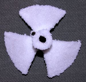 (Scratch) A Salt Vehicle For the saucer body, I used only the top portion of the Applewhite plans. Due to the curvature in the salt container, my saucer disk didn't retain a nice conical shape, so I cut out three triangles, serendipitously mimicking the nuclear radiation symbol. These were glued to the motor tube, remembering to cant them as for the Applewhite saucer. Since there was no bottom saucer disk or support struts, I made extra thick glue fillets. A launch lug was made from a soda straw, slit and resize appropriately.