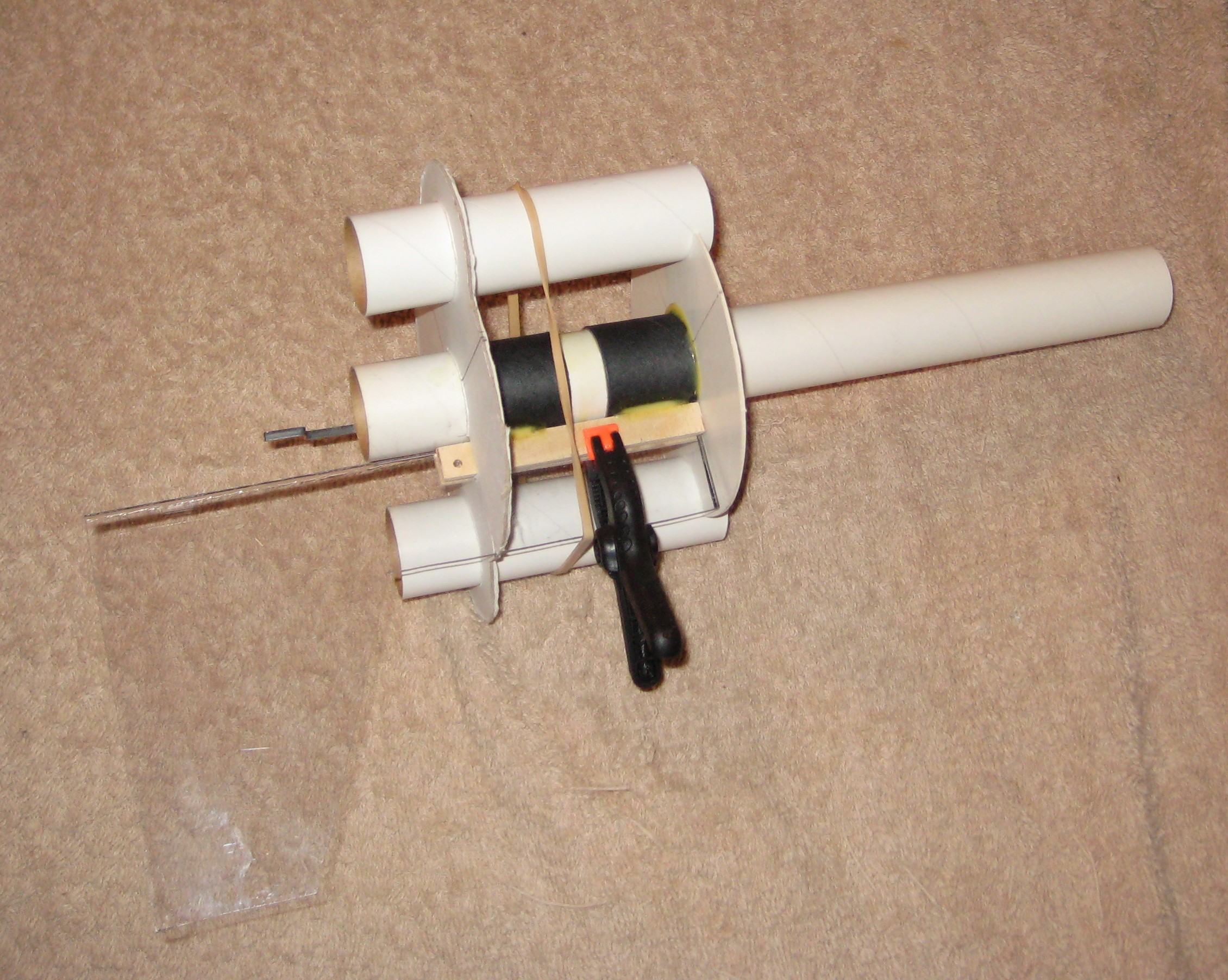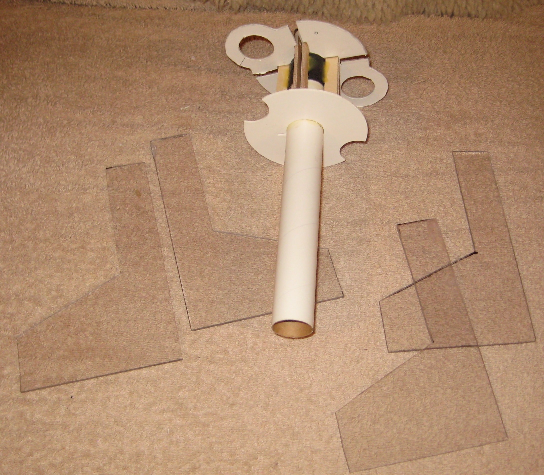 The fins are cut from 3/32” thick polycarbonate using a scroll saw after first making a few practice cuts. It is helpful to cut the fins ahead of time in order to set the slot guides at the proper locations. I first cut one slot in the cardboard for the clear fin all the way across and a small notch next to the central tube to accommodate the 1/8” x 3/8” aircraft birch strut that protrudes beyond the cardboard bulkhead as shown in Fig. 2.