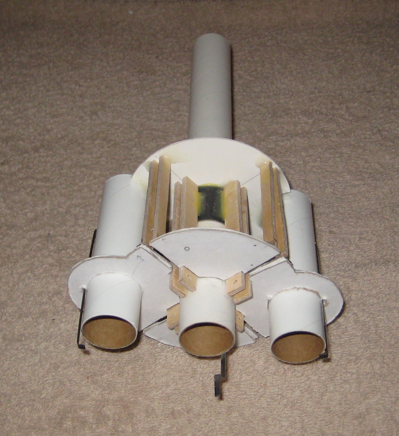 This completes the most time consuming part of the modification and the rest of the construction follows the Estes instructions except for a few more details. I permanently glued in the simulated outer (booster) nozzles, but I found that I needed to leave inner (sustainer) nozzle removable in order to get the fins in and out as shown in Fig. 5. In addition I had to cut notches into the sides of the fins so that they would fit around the sustainer nozzle.