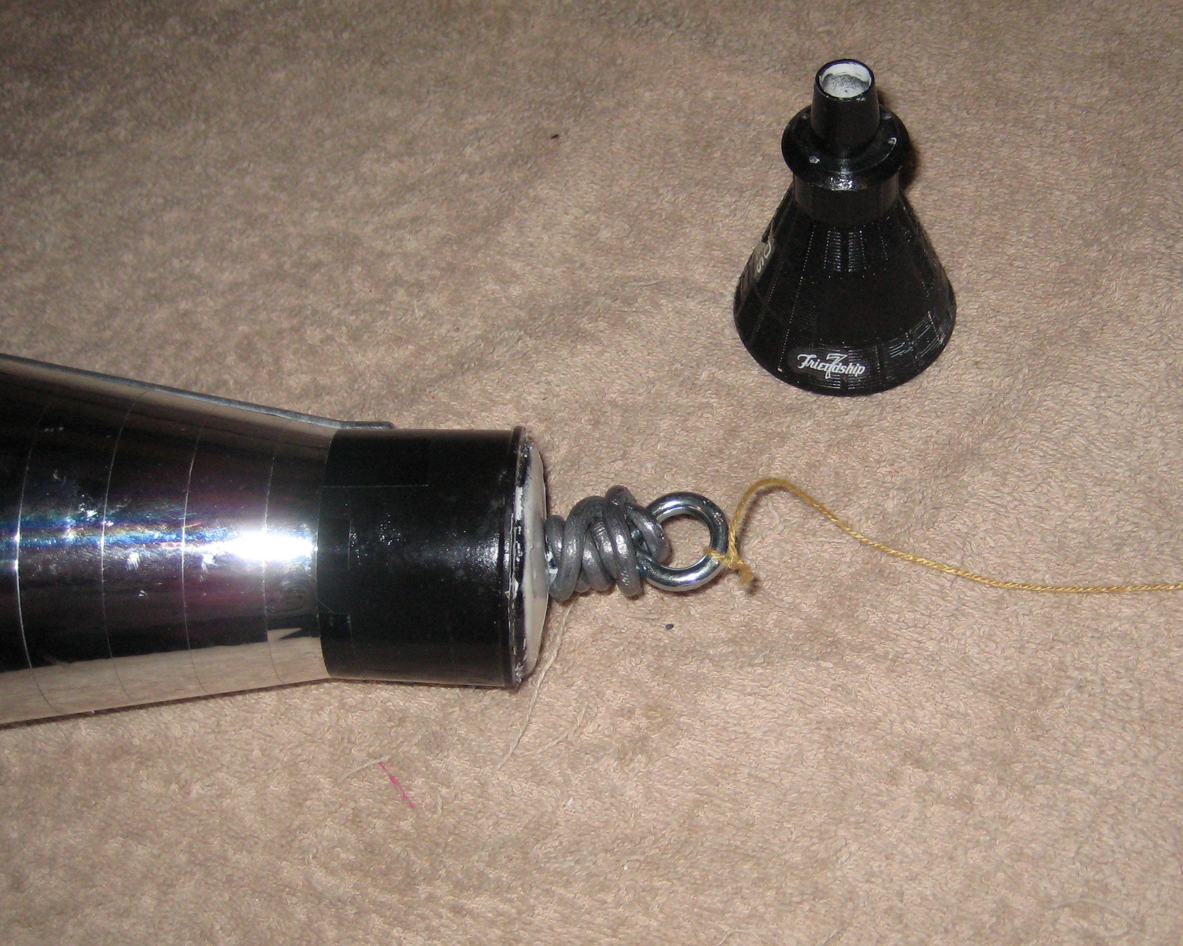 These modifications in the aft-end require quite a bit of nose weight in the forward end as shown in Fig. 7. I put a large screw eye in the forward plastic transition section and wrapped about 2 ounces of flexible lead weight that I bought a fishing tackle store.