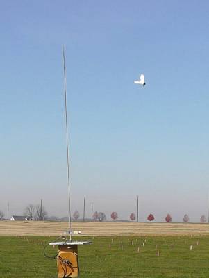 After a long and laborious 20 minute search, the rocket was located about 250 feet upwind in the grass sans streamer. The only damage appeared to be a heavy dent in the leading edge of the fin, about the width of the body tube. It appears that the recoil of the extra-long shock cord slammed the payload tube against the fin, since there was nothing in the grass to cause this type of damage. So now this rocket is back in the repair shop for the fourth time, and will emerge some day with yet another scar.