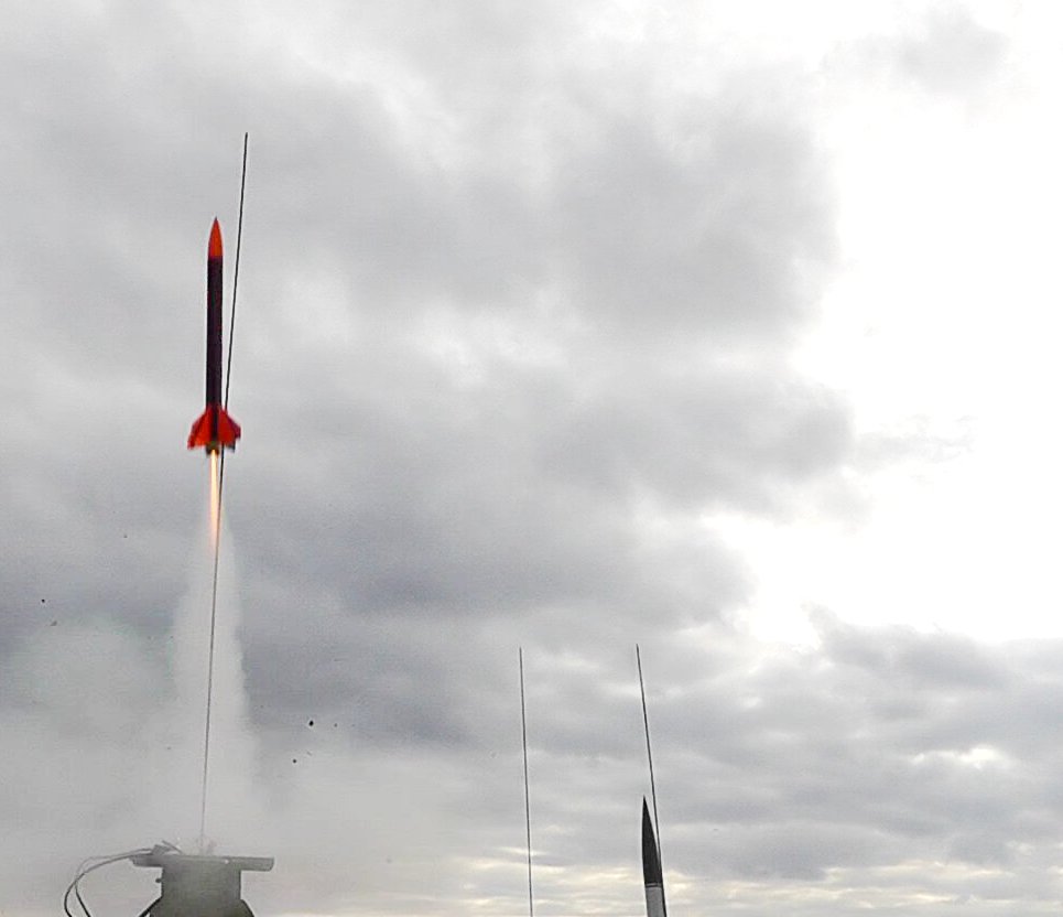 Often with this rocket in the cold air, the thick plastic streamer gets stiff and doesn’t unfurl or gets stuck in the tube, so this time I packed it very carefully, only satisfied on my third attempt to squeeze it and the shock cord and the Altimeter Two into the small body tube. This time I noticed the wobble of the rocket on the launch rail because the molded plastic lug is too large, making a mental note to try a 3/16 rod next time. This is an odd lug size for such a small, light rocket.