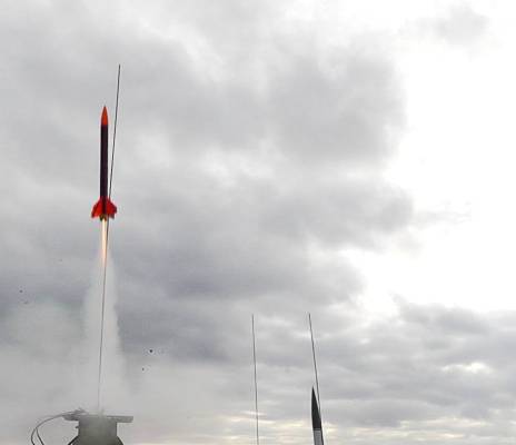 The Cyclone: This is a modern Almost-Ready-to-Fly kit from Quest. The length and weight of this model is on par with the Estes Alpha, but a slightly smaller diameter. It has plastic fin assembly, stick-on body decal, streamer recovery. Uses 1/2A - C motors. Reasonably light model. I think this model could be called something else, but it came in a Quest starter kit and the other model was busted (I got a deal), so I used the "Cyclone" tube wrapper because it looked better, so now I just got used to calling it the Cyclone. It could just have well been called "Chain Reaction", the other decal. I modified the streamer bay with vent holes to install an Altimeter One. Notice also, to break up the monotony of the plain orange fins, I added the cheesy stripes to the fins using leftover sticker material from the body wrap. This model doesn't get much respect from me though; I didn't build it, just some minor assembly work. Not only is it simple and colored ugly, the plastic fins means it is a toy. A real rocket has balsa or wood fins and paint. I must admit though, it flies fast and high and is pretty rugged. This rocket has flown higher than NASA's VAB (Vehicle Assembly Building) in Cape Kennedy Florida – and that was only with a B6-4!