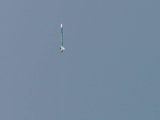 This was the first ever test flight of the new DEFCON 1. Several remarked that this was a good looking rocket, and I hoped it would stay that way. The winds were dying down a bit, and I felt that the higher impulse, relatively light weight and long length would keep this rocket from being affected by the winds much.